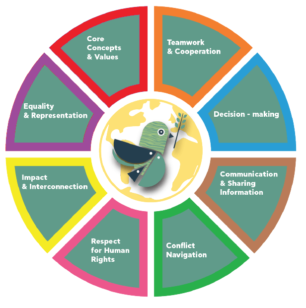 The Peace Please game is based on the eight areas of a Culture of Peace as defined by the UN (see image below), which were translated into the context of organisations.